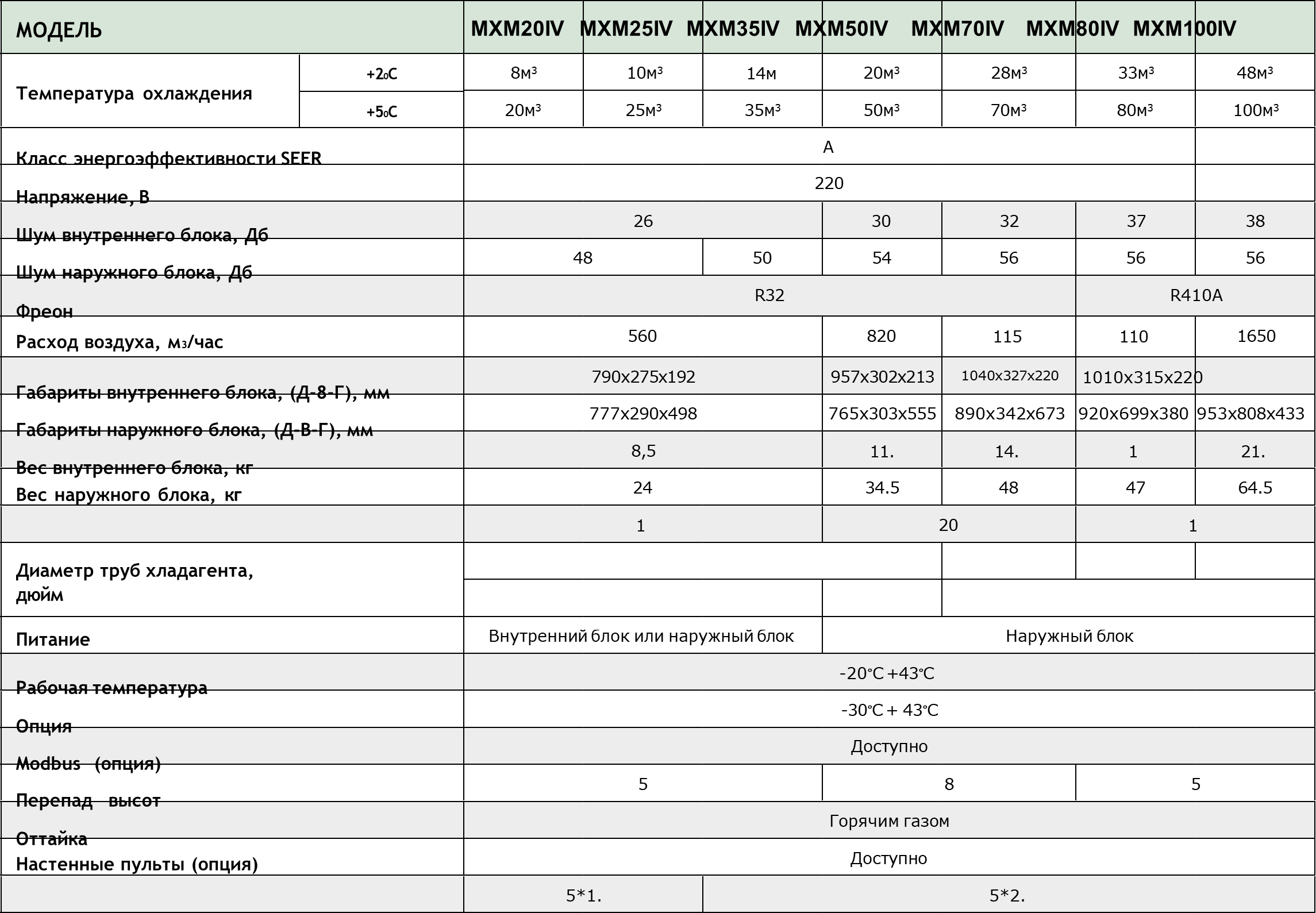 Хладагент (фреон): R 32 (MXM20IV - MXM70IV); R410A (MXM80IV - MXM100IV)